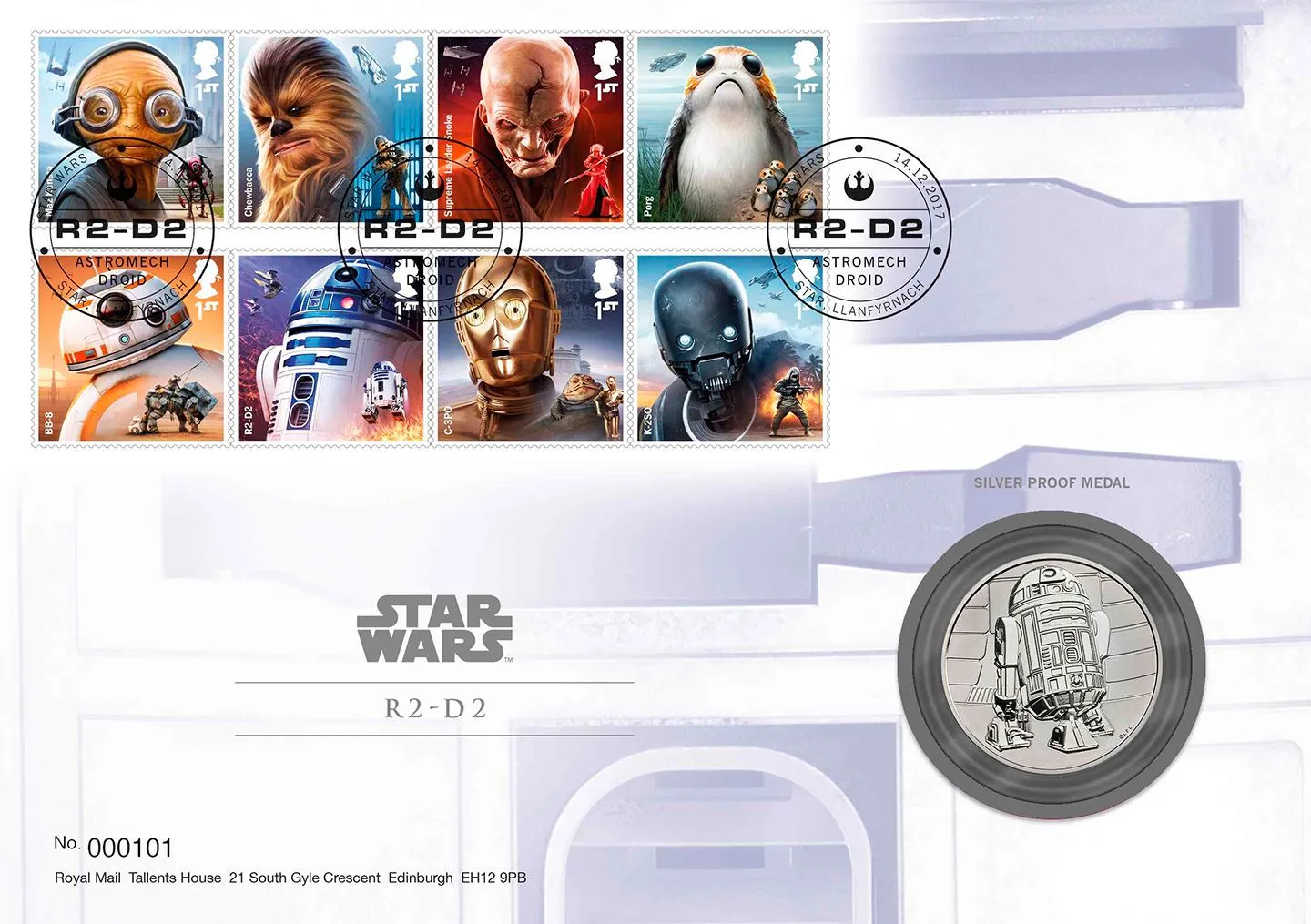 The above Royal Mail PSB: Star Wars Last Jedi were issued on 14 December 2017 by Royal Mail and feature the following stamp designs: . The R2-D2 Medal Cover first day cover with the Star, R2-D2, Special Handstamp postmark has been produced by Royal Mint and features these stamps which can make a very collectible and lovely gift.