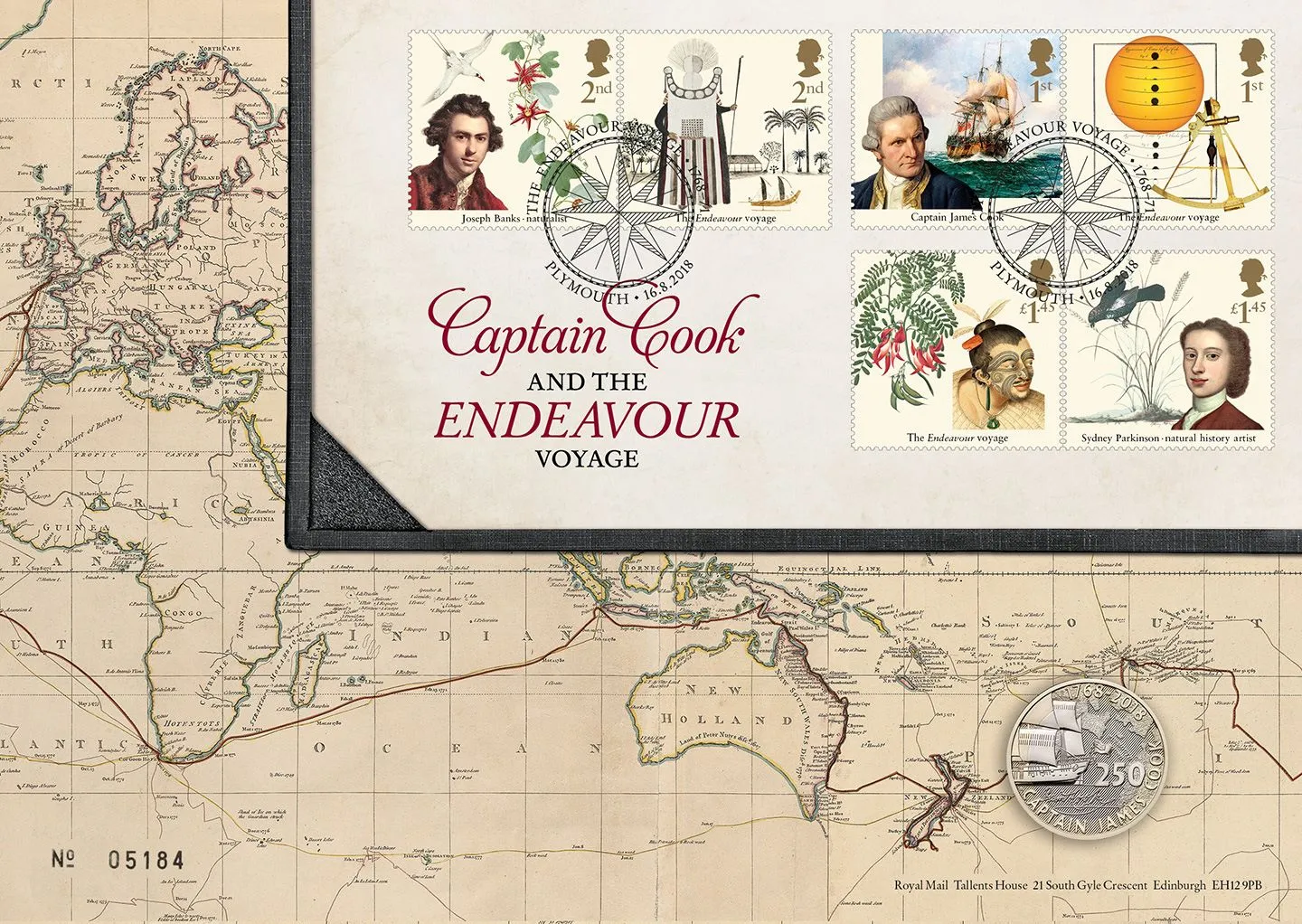 The above Royal Mail Captain James Cook were issued on 16 August 2018 by Royal Mail and feature the following stamp designs: 2nd Joseph Banks; 2nd Chief Mourner of Tahiti; 1st Captain James Cook; 1st Transit of Venus; £1.45 Maori Chief; £1.45 Sydney Parkinson. The Map of Voyage first day cover with the Plymouth, Compass, Special Handstamp postmark has been produced by Royal Mint and features these stamps which can make a very collectible and lovely gift.