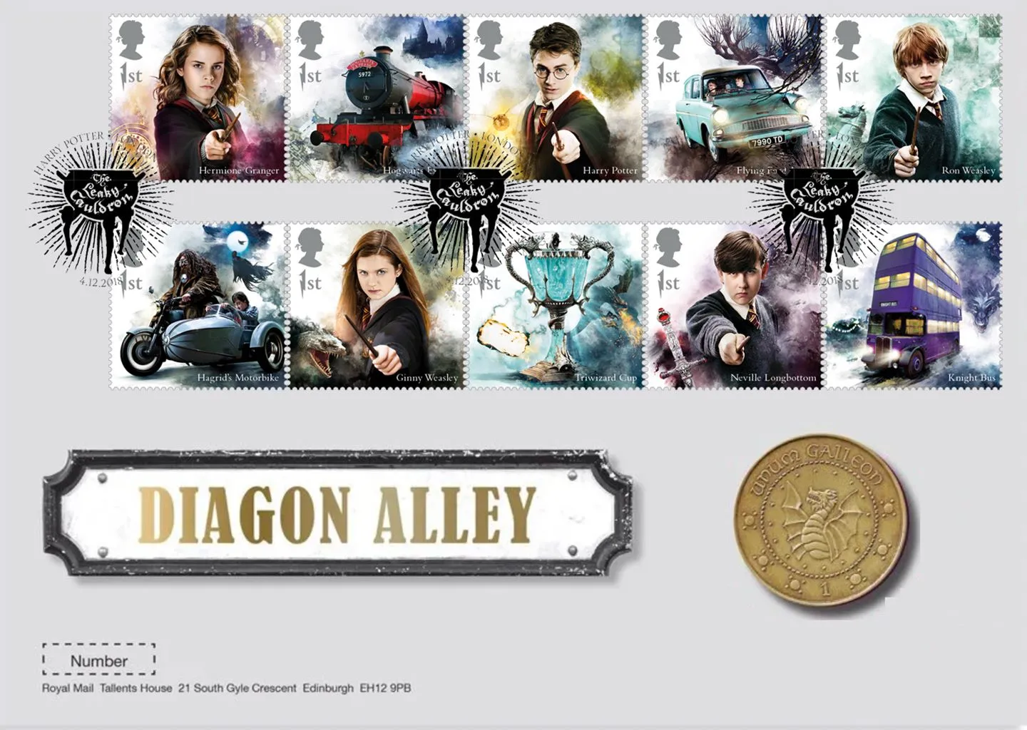 The above Royal Mail PSB: Harry Potter were issued on 04 December 2018 by Royal Mail and feature the following stamp designs: . The Diagon Alley first day cover with the London, The Leaky Cauldron, Special Handstamp postmark has been produced by Royal Mint and features these stamps which can make a very collectible and lovely gift.