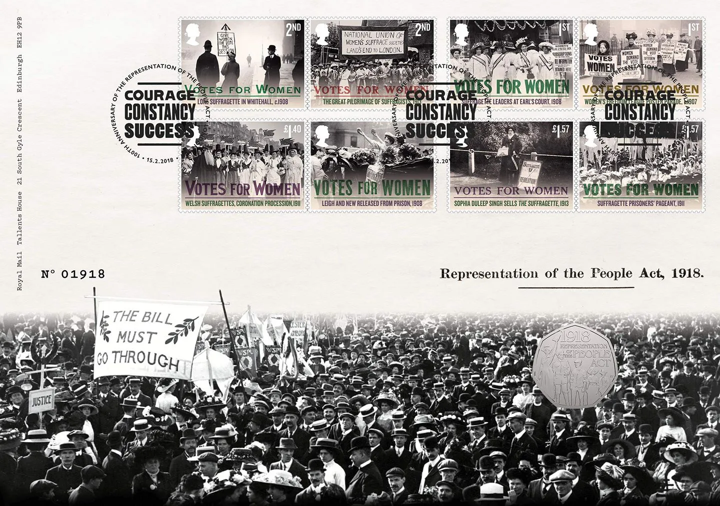 The above Royal Mail Votes for Women were issued on 15 February 2018 by Royal Mail and feature the following stamp designs: 2nd Lone Suffragette Whitehall 1908; 2nd Great Pilgrimage 1913; 1st Suffragette Leaders Earl's Court 1907; 1st Poster Parade 1907; £1.40 Welsh Suffragettes 1911; £1.40 Released from Prison 1908; £1.57 Sophia Duleep Singh 1913; £1.57 Prisoners' Pageant 1911. The Representation of the People Act first day cover with the London, Courage Constancy Success, Special Handstamp postmark has been produced by Royal Mint and features these stamps which can make a very collectible and lovely gift.