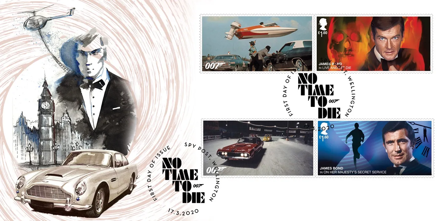 The above Royal Mail James Bond: Generic Sheet were issued on 17 March 2020 by Royal Mail and feature the following stamp designs: . The Live and Let Die & OHMSS first day cover with the Wellington, No Time To Die, Special Handstamp postmark has been produced by Bradbury and features these stamps which can make a very collectible and lovely gift.