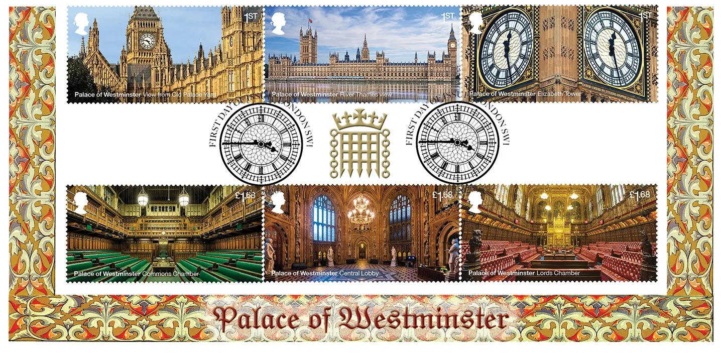 The above Royal Mail Palace of Westminster were issued on 30 July 2020 by Royal Mail and feature the following stamp designs: 1st View from Old Palace Yard; 1st River Thames view; 1st Elizabeth Tower; £1.68 Commons Chamber; £1.68 Central Lobby; £1.68 Lords Chamber. The Portcullis first day cover with the London SW1, Big Ben's Clock, Special Handstamp postmark has been produced by Bradbury and features these stamps which can make a very collectible and lovely gift.