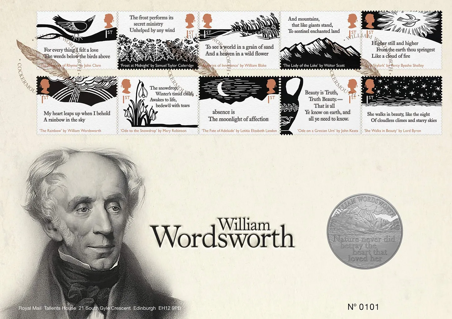 The above Royal Mail Romantic Poets were issued on 07 April 2020 by Royal Mail and feature the following stamp designs: 1st John Clare; 1st Samuel Taylor Coleridge; 1st William Blake; 1st Walter Scott; 1st Percy Bysshe Shelly; 1st William Wordsworth; 1st Mary Robinson; 1st Letitia Elizabeth Landon; 1st John Keates; 1st Lord Byron. The William Wordsworth first day cover with the Cockermouth, Quill, Special Handstamp postmark has been produced by Royal Mint and features these stamps which can make a very collectible and lovely gift.