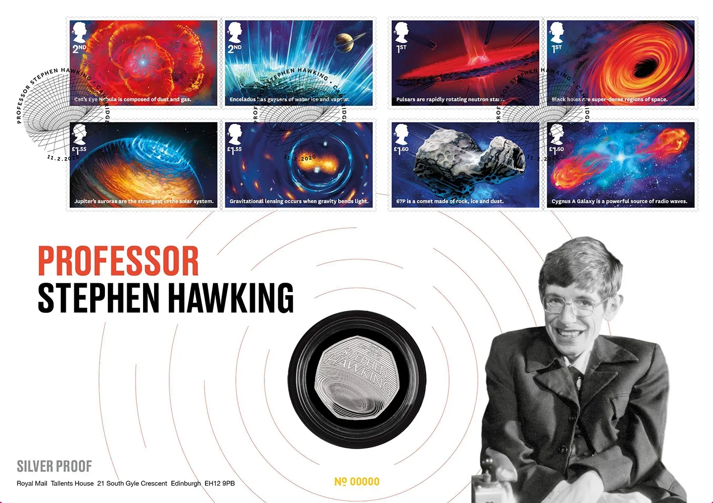 The above Royal Mail Visions of the Universe were issued on 11 February 2020 by Royal Mail and feature the following stamp designs: 2nd Cat''s Eye Nebula; 2nd Enceladus; 1st Pulsars; 1st Black Holes; £1.55 Jupiter''s Aurora; £1.55 Gravitational Lensing; £1.60 Comet 67P; £1.60 Cygnus A Galaxy. The Stephen Hawking first day cover with the Cambridge, Sound waves, Special Handstamp postmark has been produced by Royal Mint and features these stamps which can make a very collectible and lovely gift.