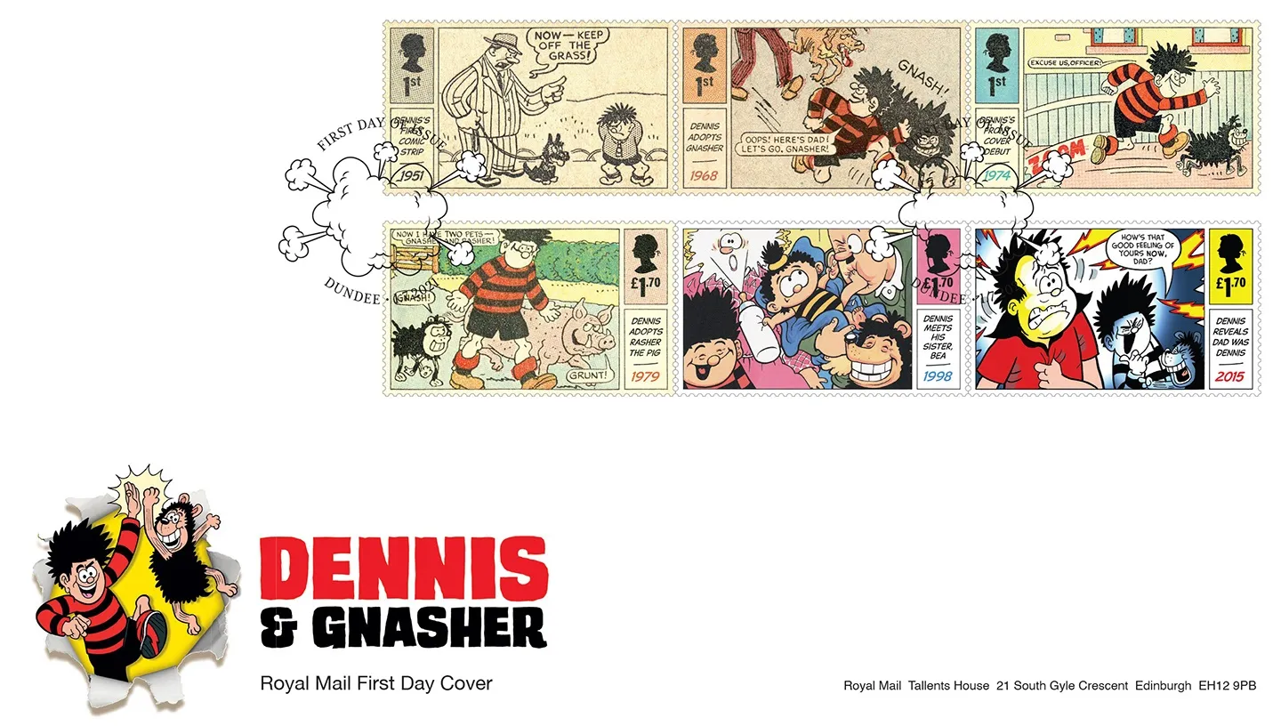 | Stamp Details: | 1st First comic strip, 1951 1st Dennis adopts Gnasher, 1968 1st Front cover debut, 1974 £1.70 Rasher the Pig, 1979 £1.70 Sister Bea, 1998 £1.70 Dennis reveals Dad, 2015 |
