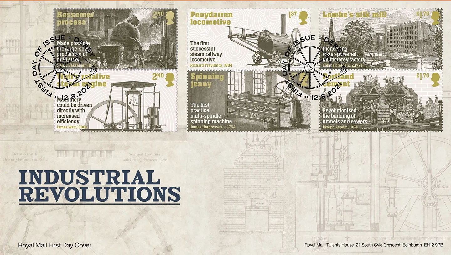 | Stamp Details: | 2nd Bessemer Process 2nd Watt Steam Engine 1st Trevithick Locomotive 1st Hargreaves Spinning Jenny £1.70 Lombe Silk Mill £1.70 Aspdin Portland Cement |
