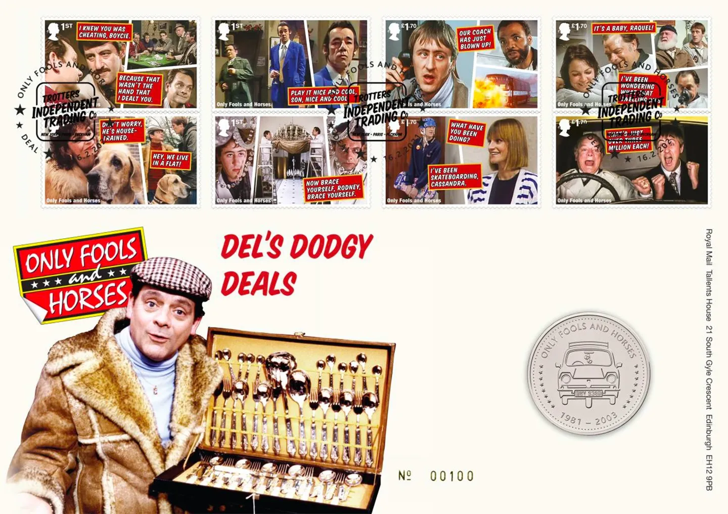 The above Royal Mail Only Fools and Horses were issued on 16 February 2021 by Royal Mail and feature the following stamp designs: 1st Del Boy and Boycie; 1st Del Boy and Trigger; 1st Marlene, Del Boy and Rodney; 1st Del Boy and Rodney; £1.70 Rodney and Denzel; £1.70 Del Boy and Raquel; £1.70 Rodney and Cassandra; £1.70 Del Boy and Rodney. The Del Boy Silver Service first day cover with the Deal, Independent Trading Co, Special Handstamp postmark has been produced by Royal Mint and features these stamps which can make a very collectible and lovely gift.