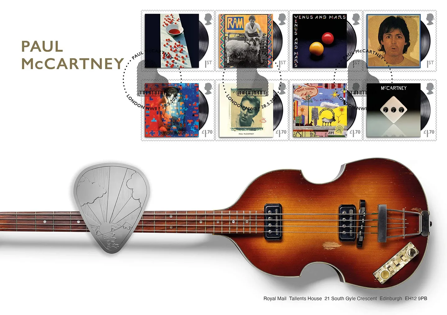 The above Royal Mail Paul McCartney were issued on 28 May 2021 by Royal Mail and feature the following stamp designs: 1st McCartney; 1st RAM; 1st Venus and Mars; 1st McCartney II; £1.70 Tug of War; £1.70 Flaming Pie; £1.70 Egypt Station; £1.70 McCartney III. The Guitar first day cover with the London, Piano, Special Handstamp postmark has been produced by Royal Mint and features these stamps which can make a very collectible and lovely gift.