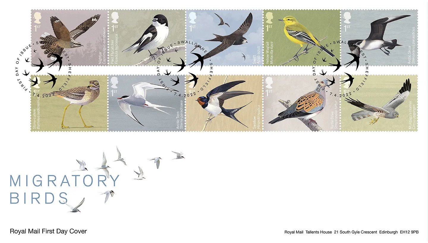 | Stamp Details: | 1st Nightjar 1st Pied Flycatcher 1st Swift 1st Yellow Wagtail 1st Arctic Skua 1st Stone-curlew 1st Arctic Tern 1st Swallow 1st Turtle Dove 1st Montagu’s Harrier |
