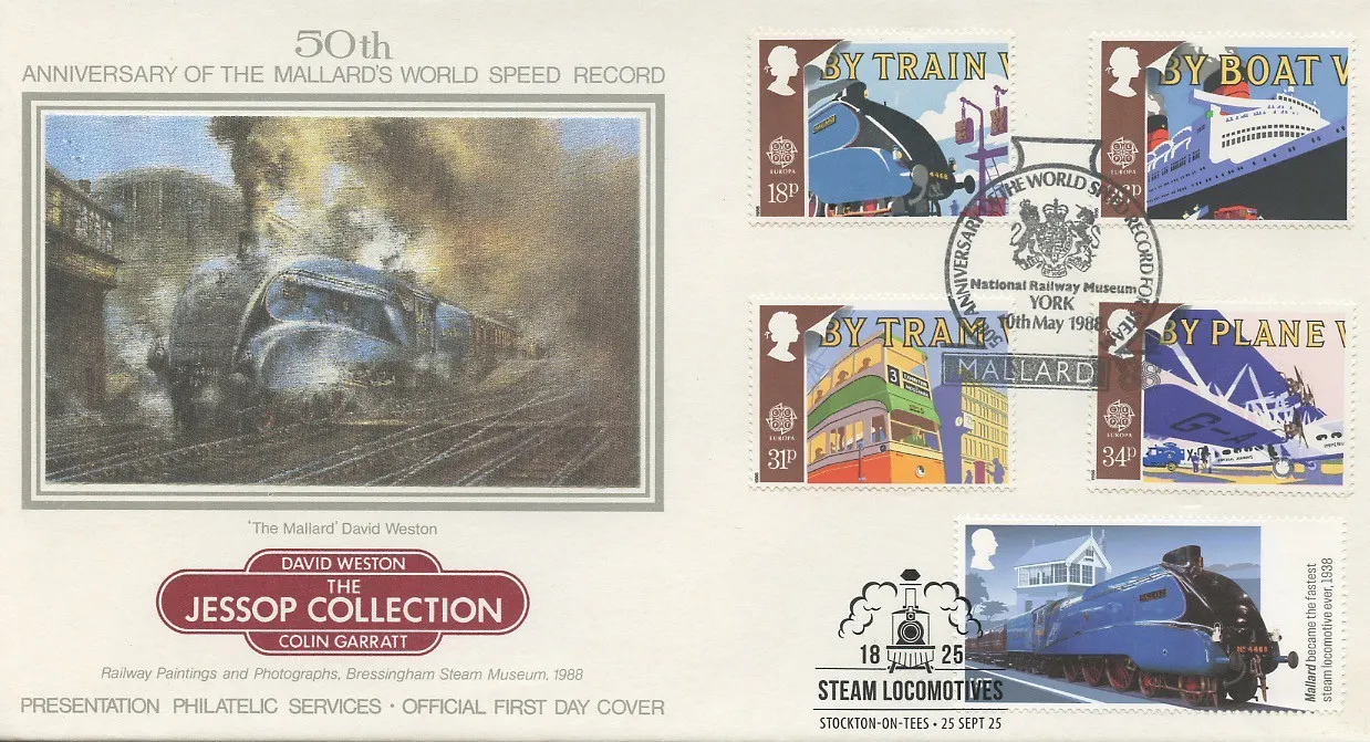 | Notes: | Mallard LNER Double dated with special Stockton-on-Tees & York postmarks 50th Anniversary - David Weston 'Silk image' Mallard, built in Doncaster. |