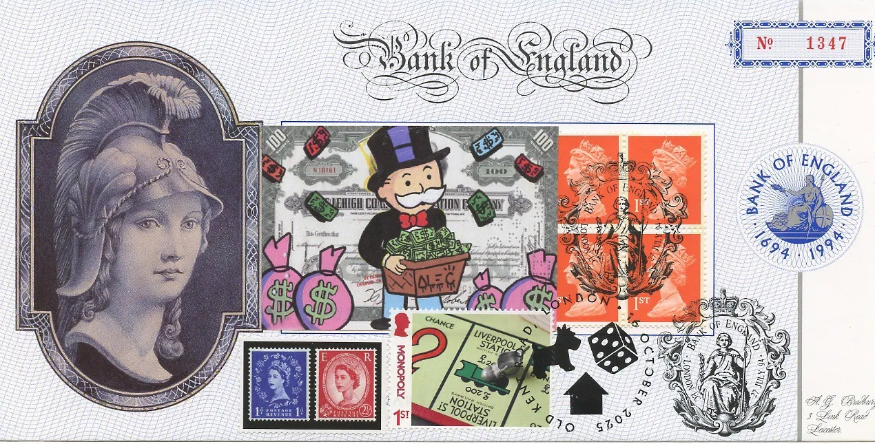 Notes: | Official Bank of England cover originally issued in 1994 to mark the Banks 300th anniversary - updated with Monopoly stamp |