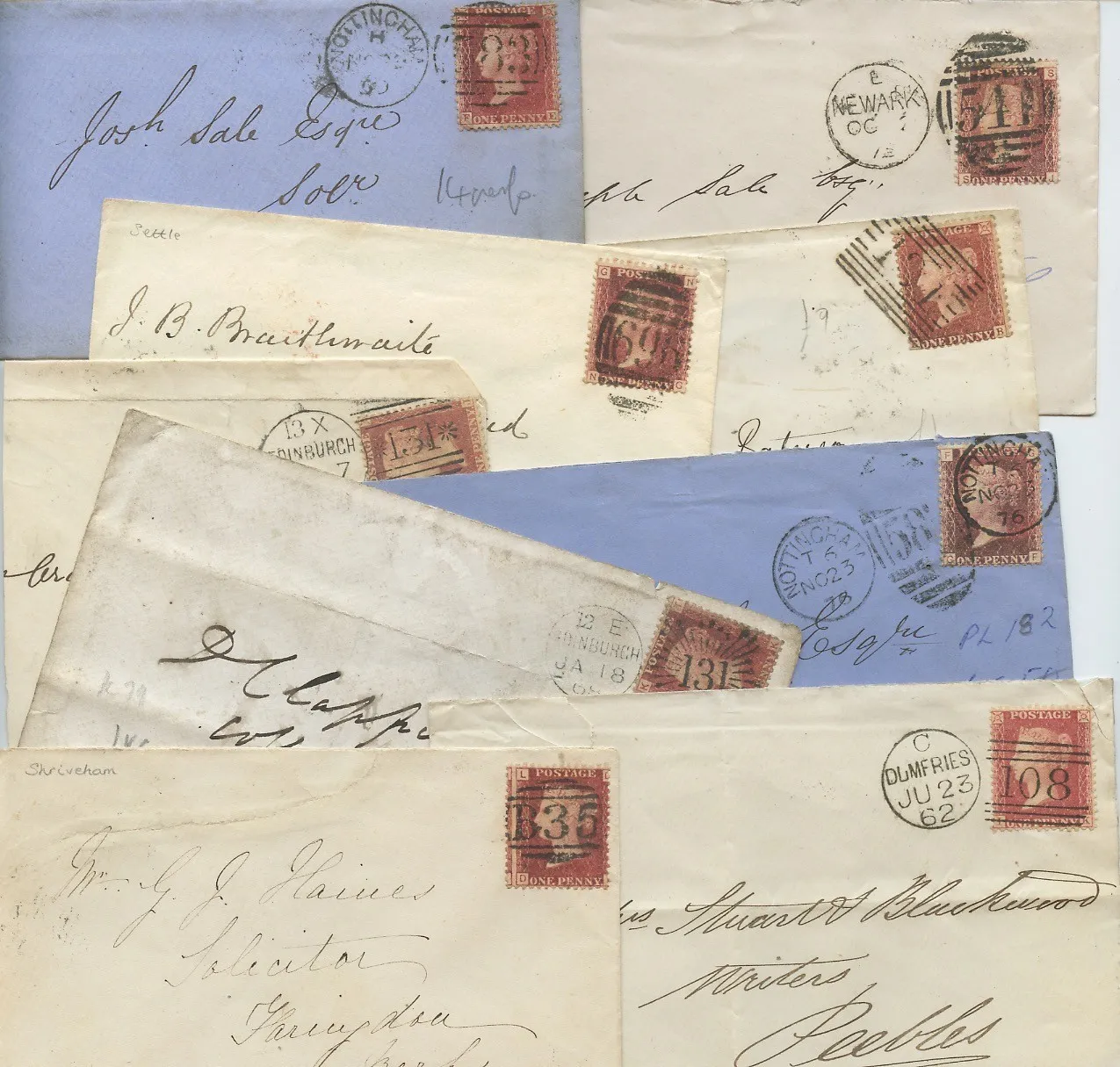 | Notes: | Penny red stamps affixed to envelopes and have all been postmarked. These are all 'one-offs'. Most have hand written addresses with postmarks from the Queen Victoria's reign. Some have black borders indicating that the person has deceased |