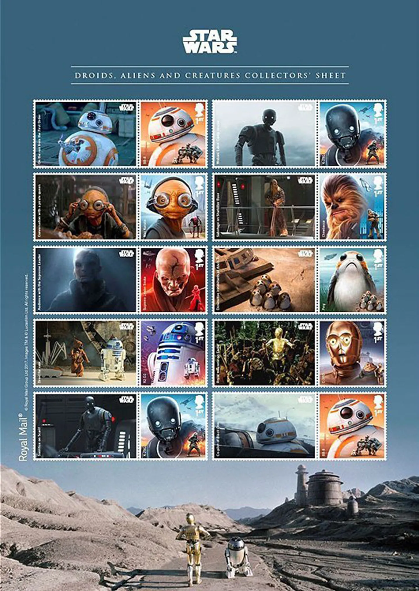 | Notes: | An A4 sized sheet featuring all 8 brand new stamps (BB8 & K-2SO feature twice) along with labels showing film stills from the Lucasfilm archives. The sheet comes with a protective backing card and clear plastic cover making a unique collectible souvenir. |