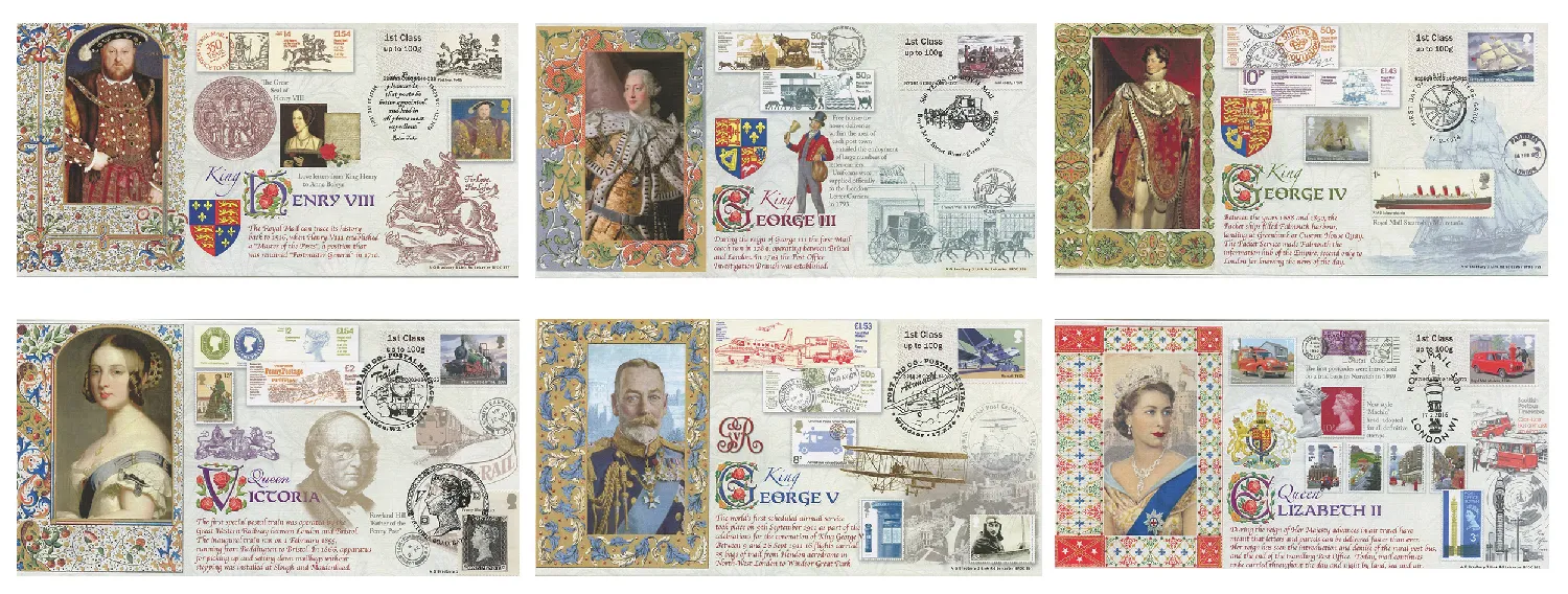 | Notes: | A beautiful collection of 6 covers depicting royals throughout the years and their association with the evolution of mail services. |